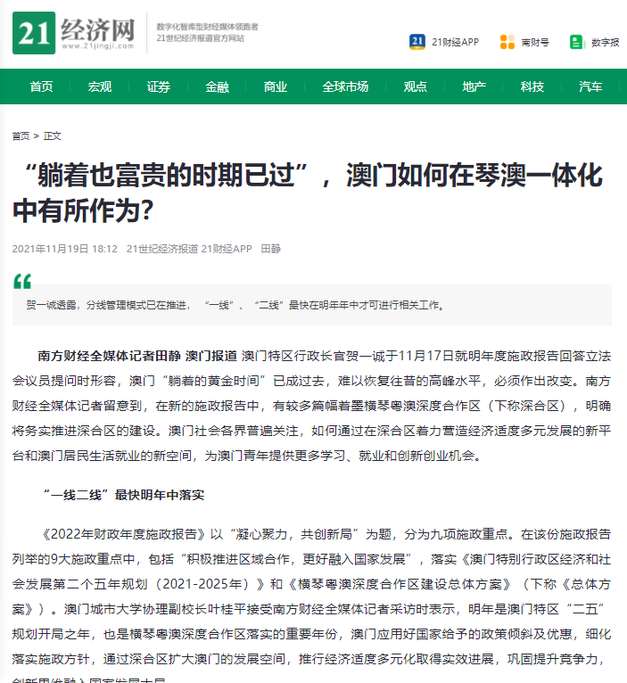 2021年11月19日,我校協理副校長、澳門社會經濟發展研究中心主任葉桂平教授接受21財經採訪,就澳門參與琴澳一體化工作發展發表了相關看法。報導內容如下: