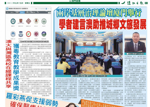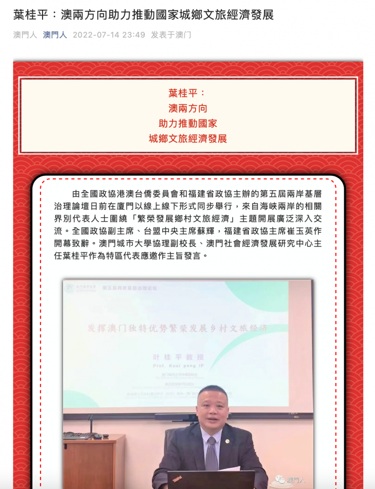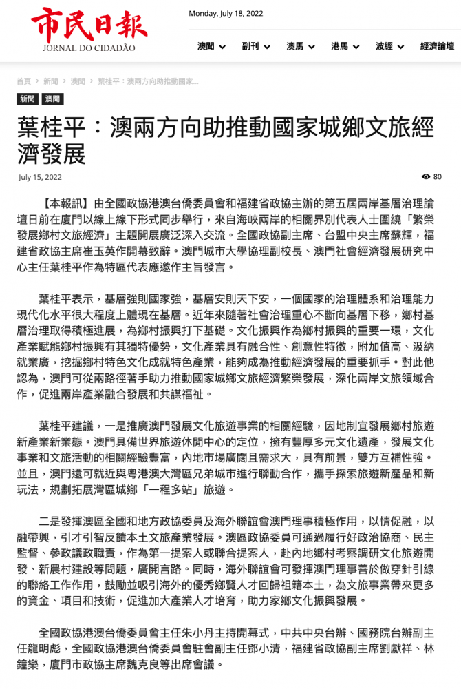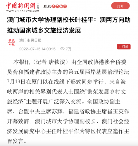 2022年7月13日,由全國政協港澳台僑委員會和福建省政協主辦的第五屆兩岸基層治理論壇在廈門以在線線下形式同步舉行。我中心葉桂平主任受邀參加,相關內容獲《市民日報》《濠江日報》《大眾報》《澳門人報》等媒體報導及中新社轉載。內容如下:
